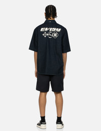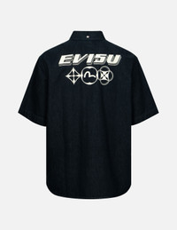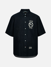KAMON AND LOGO PRINT OVERSIZED DENIM SHORT-SLEEVES SHIRT