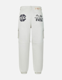 2ESHTM5PO1192FFCP Breaking from conventional rugged styles, these detachable cargo joggers are crafted from lightweight cotton canvas, merging workwear practicality with a modern, fashionable cut. The unique Kamon and logo prints add a touch of detail and character. The woven tapered design allows for diverse streetwear outfits, blending traditional and contemporary elements effortlessly. - Fashion fit - 62% Cotton, 38% Polyester - Kamon, Seagull and EVISU logo prints - Elasticated cuffs, 6 pockets, zip fly - EVISU Premium Quality Kamon tag
