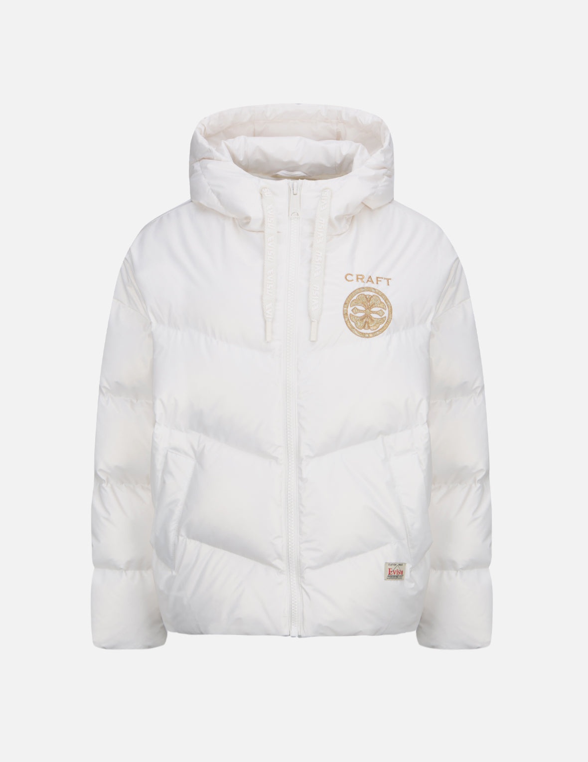 2EAHTW1NJ253OSPL This pearlized mint color down jacket offers a novel style to keep you warm this fall. Cut for loose fit, the jacket features a sophisticated embroidery of gold Kamon and CRAFT text at left chest, while the drawstring is peppered with EVISU logo for a cool take. - Oversized fit - Kamon and text embroidery, EVISU logo drawstring - Drawstring hood, long sleeves, 2 pockets - Zip fastening - Custom Made EVISU Heritage Tag - Body: 100% Polyester; Lining: 100% Nylon