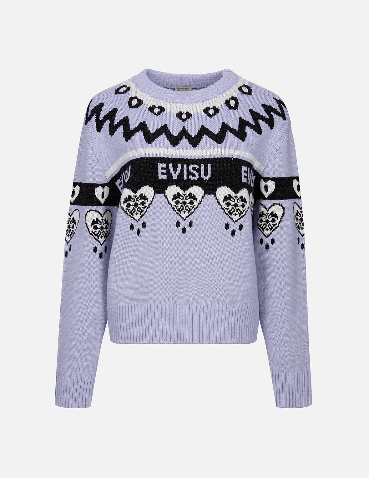 2EAHTW3SR4113LFWX This purple sweater from EVISU is made from a wool-blend chosen for its exceptional softness. The crew-neck piece is designed for a loose fit, featuring heart-shape Kamon and Logo pattern jacquard to celebrate winter ambience. - Loose fit - Heart-shape Kamon and Logo pattern jacquard - Long sleeves, crew neck, ribbed trims - 50% Cotton, 50% Wool FIT & STYLING: LOOSE CARE DO NOT WASH DO NOT BLEACH DO NOT TUMBLE DRY DO NOT IRON DRY CLEAN ONLY
