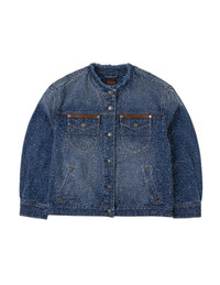 2EAHTW5DJ4044FFDN This collarless denim jacket storms the fashion scene with an avant-garde design! Crafted from premium denim and treated with a special wash-dye process, it boasts a one-of-a-kind snowflake texture effect. The notched collar adds a rich retro vibe, while the leather accents on the chest pockets bring striking details, and the seagull embellishment on the back highlights the brand’s soul. Slip it on to instantly become a must-have icon for trendsetters, unleashing unmatched unique charm! - Fashion fit - 100% Cotton - Leather trim pockets - Distressed collar - Button fastening, 4 pockets - Godhead leather patch