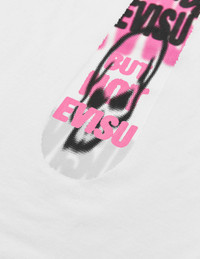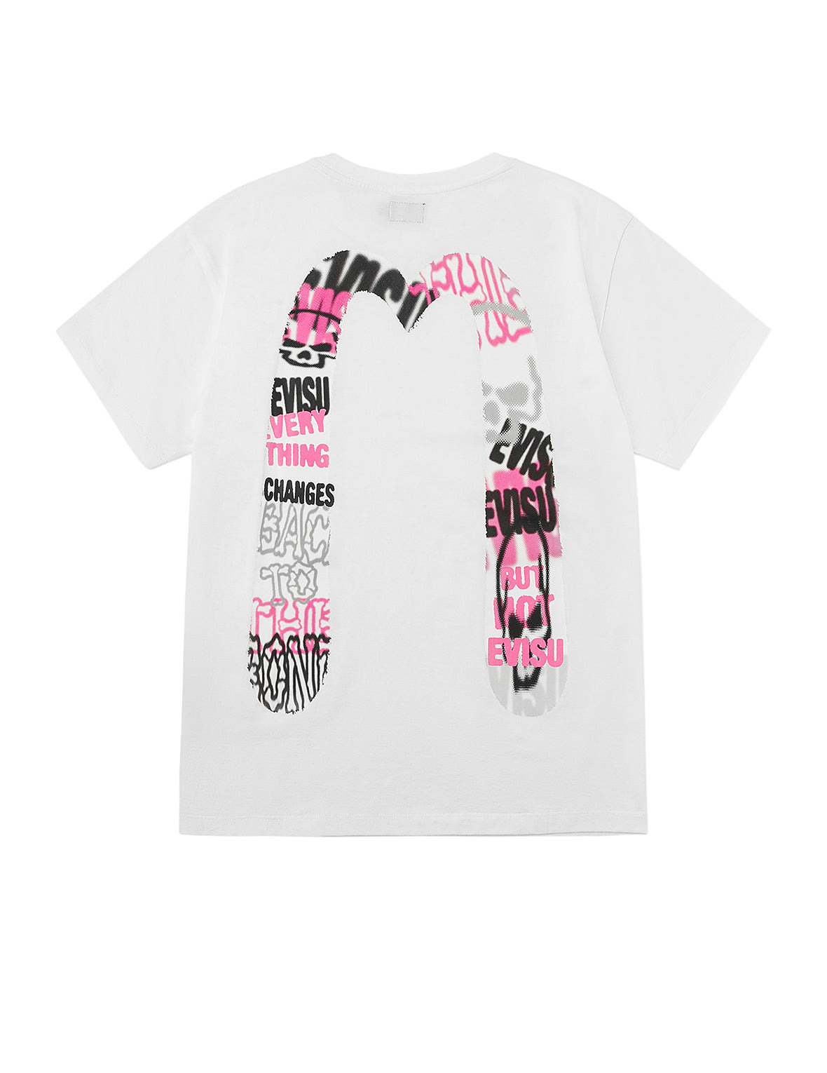 2EAHTW5TS4038BFCT Featuring a graffiti theme, this EVISU T-shirt showcases overlapping logo prints on the front and a Daicock print on the back, incorporating elements like slogans, logos, and skulls. The overall design presents a strong contrast of colors and a rebellious style. - Boyfriend - 100% Cotton - Logo and graffiti Daicock print