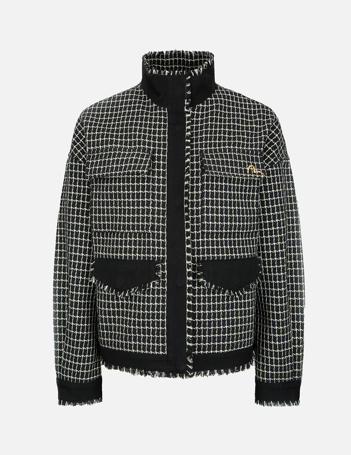 2EAHTW2JK747LFPQ EVISU’s tweed jacket is made from metallic wool-blend for a check pattern design with fabric blocking details, and is finished with seagull and Kamon embroidery. It is cut for a loose fit, perfect for layering of a wide range of styles. - Loose fit - Fabric blocking design - Kamon and seagull embroidery - Long sleeves, zip fastening, 4 pockets - Fabric A: 34% Polyester, 27% Wool, 22% Acrylic, 14% Nylon, 3% Lurex; Fabric B: 100% Cotton; Lining: 100% Polyester