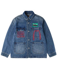 2ESEJM6DJ6001RXDN Vintage-washed denim chore jacket with faded seams, soft broken-in texture, and iconic daicock motif print accent the bold and playful look. The multi-pocket design emphasizes its functional property. - 100% Cotton - Vintage washed denim - 4 pockets - Button Closure