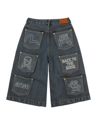 2EAHTW5JE4010FFDN With the theme “Back To The Bone,” this trendy cropped denim jean revives the core spirit of EVISU, embodying an ultimate pursuit of individuality and freedom! Blending the brand’s iconic multi-pocket elements with a contemporary fit, it reinterprets classic style; the relaxed cut delivers a boyfriend-inspired bold vibe, exuding rebellious charm when worn by women, with the gray-blue wash effect adding extra depth. The back features a striking multi-pocket design, adorned with bold coarse-stitch embroidery patterns—including seagull, logo, the brand’s classic character Chin-Chin, skull, and this season’s theme slogan “Back To The Bone”—unleashing a carefree attitude and igniting a fresh street fashion revolution! - Fashion fit - 100% Cotton - Multi-pocket design - Seagull, logo, classic character Chin-Chin, skull, and slogan “Back To The Bone” embroidery - Zip fly - Godhead leather patch