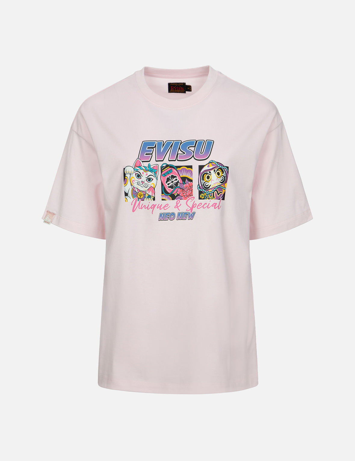 2ESHTW4TS4105OSCT This T-shirt features multiple prints, combining fashion with traditional elements to create a visually rich and diverse effect. The prints consist of logos, Daruma, Fortune Cat, and festival elements, intertwining to showcase a unique style and innovative design that is full of artistic and personal flair. FIT & STYLING: OVERSIZE CARE MACHINE WASH COLD INSIDE OUT DELICATE CYCLE DO NOT BLEACH HANG DRY ONLY COOL IRON ON REVERSE SIDE IF NEEDED STEAM IRONING MAY CAUSE IRREVERSIBLE DAMAGE DO NOT DRY CLEAN DO NOT IRON ON PRINT