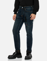 2EAHTM4JE104617DN EVISU’s carrot-fit jeans features a special washing process, creating a natural faded effect that adds a vintage touch. The back pocket is printed with a unique Navajo-style tapestry pattern, which is cleverly combined with the brand's iconic seagull logo, exhibiting a rich ethnic vibe. Complementing this design is a detachable brand logo chain, which adds personality and vibrancy to the overall look. - 2017 Carrot fit - 100% Cotton - Navajo style tapestry Seagull print - Detachable brand logo chain - Button fly, 5 pockets - Godhead leather patch