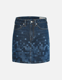 2EAHTW4SK4049XXDN This denim skirt exudes a subtle elegance amidst its simplicity, blending practicality and trendiness. The front and back feature a deep and light-colored plaid pattern, which reveals hidden seagull in a pixelated style, embodying the brand's essence with a sense of whimsy. The back pocket is adorned with a pixelated white seagull embroidery, adding visual depth. FIT & STYLING: REGULAR CARE MACHINE WASH COLD INSIDE OUT AND SEPARATELY DELICATE CYCLE DO NOT BLEACH HANG DRY ONLY COOL IRON ON REVERSE SIDE IF NEEDED STEAM IRONING MAY CAUSE IRREVERSIBLE DAMAGE DO NOT DRY CLEAN DO NOT IRON ON PRINT