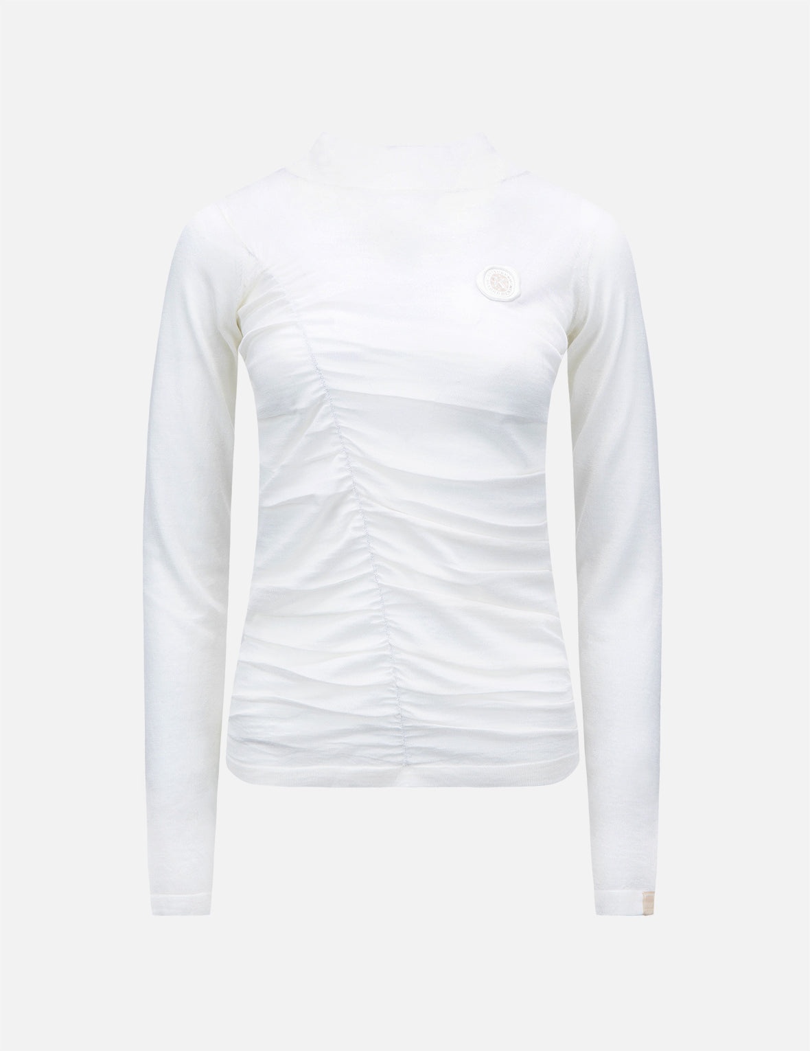 2EAGNW1SR484SLWX This knit top is crafted in a semi-sheer construction to achieve that soft, feminine feel. It can be worn on the outside to show off the stylish ruched front, or layered under another top for a modish look. - Slim fit - Ruched front - Wax seal badge