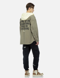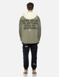 2ESHTM3SJ243LFCT An elevated wardrobe staple under the deft hand of EVISU, this jacket is crafted with a contrasting hood for a layered effect. It is also designed with seagull and slogan prints to instill a touch of craftsmanship and EVISU's signature street style into your everyday ensembles. - Loose fit - Mock 2-in-1 design - Contrasting hood - Seagull and slogan prints - Two zip pockets