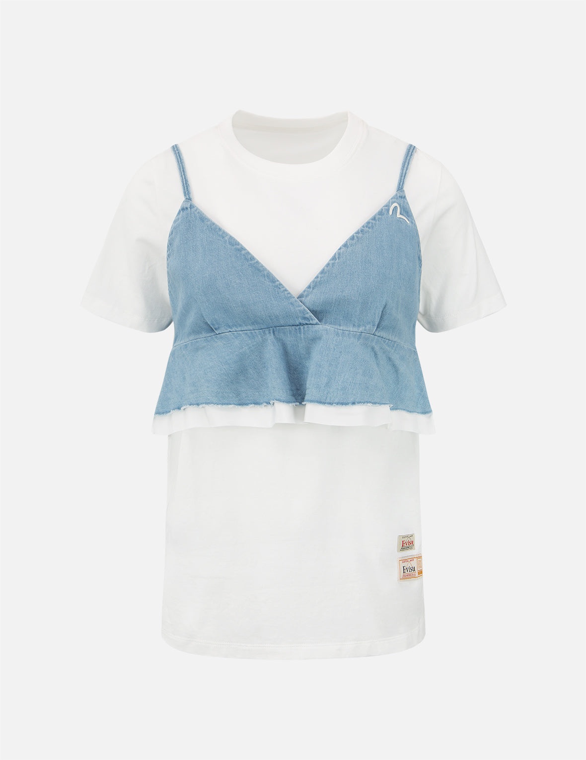 2ESHTW2BL173XXCT Constructed with a crisp white T-shirt and a light indigo denim bra top on the top, this 2-in-1 top is a statement summer staple is peppered with a seagull embroidery at chest. - Regular fit - 2-in-1 design, seagull embroidery - T-shirt: crew neck, short sleeves; Denim bra top: adjustable straps, zip fastening - Custom Made EVISU Heritage tag - Body: 100% Cotton; Denim bra top: 82% Polyester, 18% Rayon; Lining and hem blocking: 100% Polyester