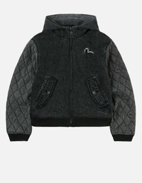 2EAHTW5DJ4019FFDQ This padded denim hoodie jacket is a streetwear essential! Featuring a two-way zipper and two large pockets, it blends practicality with a cool vibe. The back is adorned with an EVISU metal logo accessory, exuding hardcore personality. The panel design breaks convention, creating a bold, layered look that effortlessly rides the trend wave and showcases an untamed attitude! - Fashion fit - 100% Cotton - Seagull embroidery - Panel blocking design - Two-way zip, 2 pockets - EVISU metal logo trims