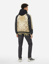 2EAHTM4JE702017DP A quintessential piece from EVISU, these jeans have long been a favorite in the fashion industry. Crafted from raw heavyweight denim, the back pockets are adorned with striking gold seagull embroidery, adding a luxurious touch. They effortlessly elevate any sweatshirt, reflecting a distinctive fashion-forward attitude. - 2017 Carrot fit - 99% Cotton, 1% Spandex - 14.5oz denim - Seagull metallic embroidery - Button fly, 5 pockets - Godhead leather patch