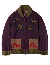 2EAEJM5CN6102RXWL This intarsia knit Cowichan sweater is your ultimate street fashion must-have! Featuring a deep purple base, it blends avant-garde spider and web patterns for a bold visual impact. The red seagull design shines vibrantly on brown pockets, paired with a retro green collar, exuding a unique personality. With its sturdy texture and meticulous details, wearing it will instantly make you the center of attention! - Relax fit - 100% Wool - Spider and web intarsia - Seagull intarsia pockets - Two-way zip, 2 pockets
