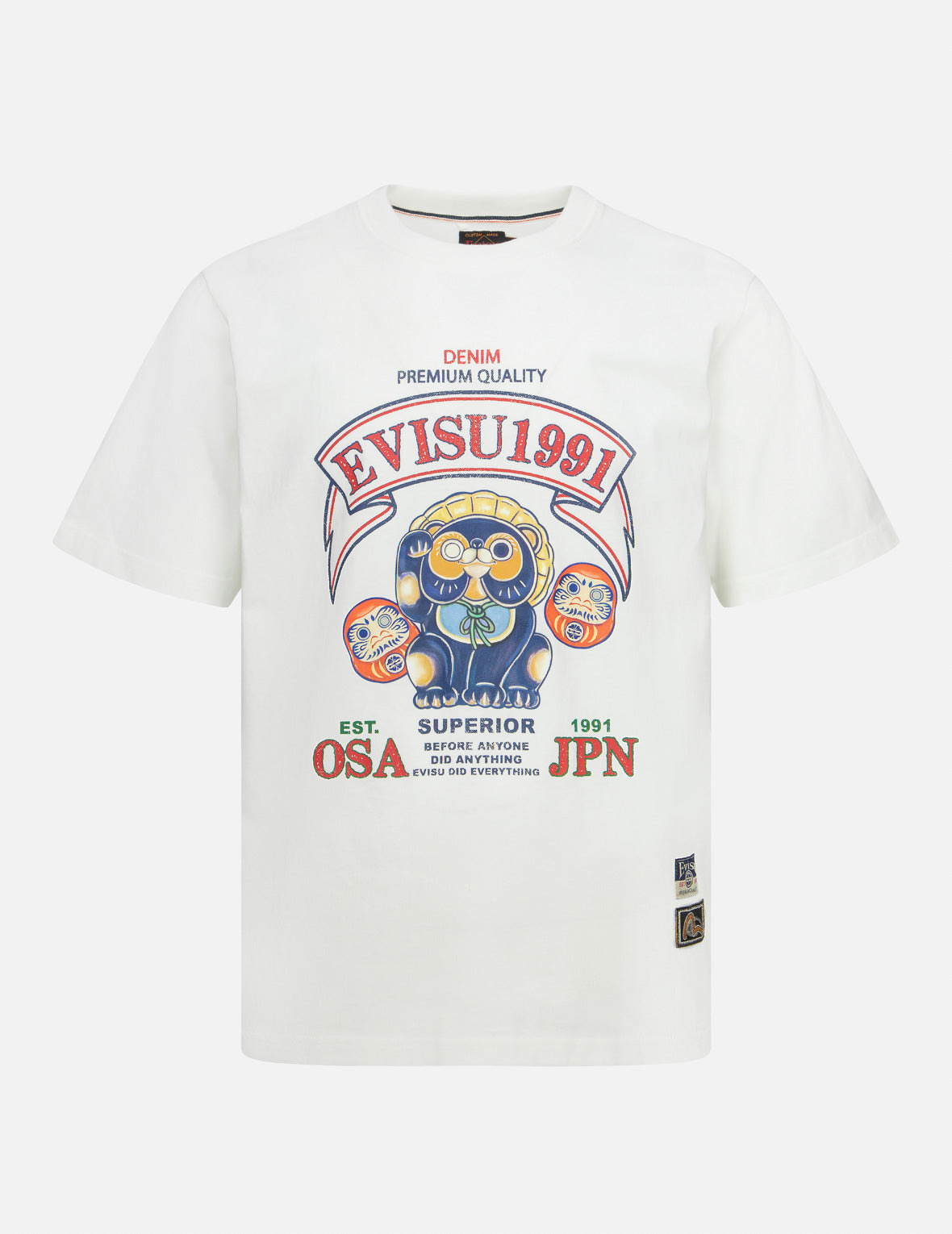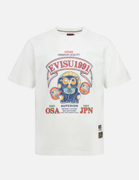 2EAHTM4TS1098XXCT Adorning the EVISU T-shirt is a playful depiction of the Shigaraki tanuki and a Daruma print on the front, seamlessly combined with the brand logo and slogan, collectively resulting in a dynamic and colorful representation of EVISU's distinctive brand identity. FIT & STYLING: REGULAR CARE MACHINE WASH COLD INSIDE OUT DELICATE CYCLE DO NOT BLEACH HANG DRY ONLY COOL IRON ON REVERSE SIDE IF NEEDED STEAM IRONING MAY CAUSE IRREVERSIBLE DAMAGE DO NOT DRY CLEAN DO NOT IRON ON PRINT