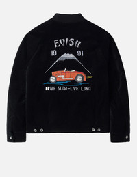2EAEJM5JK6101XXVQ This black, vintage velvet, padded souvenir jacket exudes a subtle elegance, perfectly suiting the discerning tastes of trendsetters. Crafted in a regular fit, this piece features a refined front adorned with intricate EVISU OSAKA embroidery, paired with a meticulously detailed skull motif. The back highlights the 1991 brand establishment year with a minimalist font embroidery, complemented by a delicate red car silhouette and a serene Mount Fuji design; their fine lines reveal deep cultural significance. The "Drive Slow, Live Long" slogan is gracefully embroidered below, adding a touch of effortless playfulness. - Regular fit - 100% Cotton - EVISU OSAKA and Skull embroidery - "Drive Slow, Live Long" slogan embroidery - Two-way zip, 2 pockets