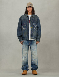 2EAHTM5DJ1002RXDN This denim jacket, from the premium collection, exudes a cutting-edge fashion vibe! The relaxed fit silhouette perfectly aligns with modern trends, showcasing a carefree street-ready attitude. Treated with Japanese wash techniques, it features a lived-in, soft texture full of character and storytelling. The hand-stitched seagull embroidery on the patched pockets adds an artistic and individualistic flair, reminiscent of vintage high-end pieces. Slip it on to instantly become the center of attention, highlighting your unique style! - Relax fit - 100% Cotton - Washed effect - Seagull embroidery - Button fastening, 4 pockets - Godhead leather patch