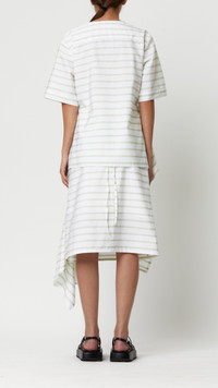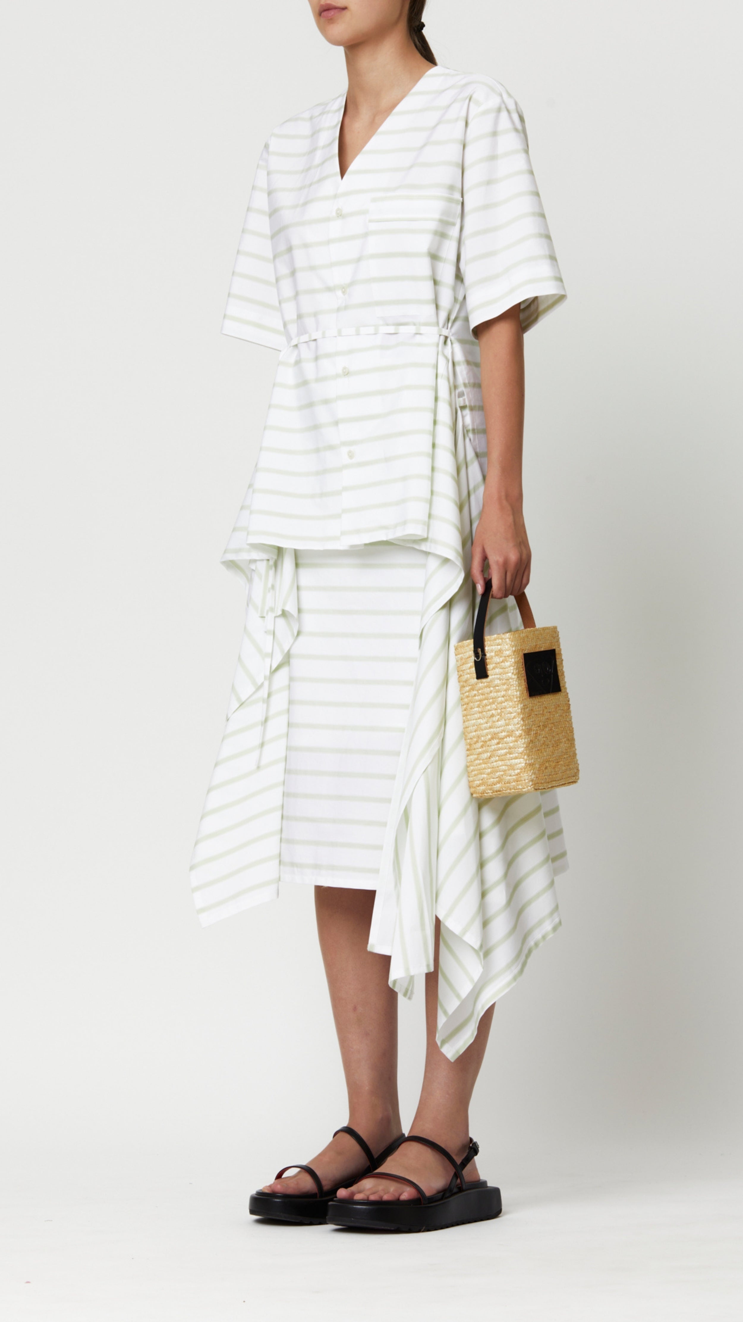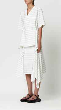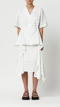 Crafted from a lightweight Italian cotton, the Striped Short Sleeve Top with Train offers a loose and oversized fit for ultimate summer style. The v-neckline and internal drawstring belt add sophistication, while the asymmetrical train brings a unique and eye-catching detail. Complete your look with our coordinating Asymmetrical Striped Skirt .