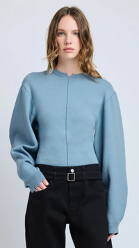 White Label The Carolina Sweater in Souffle Knit is crafted in a lark blue hue to a slim, flattering silhouette with a classic crew neckline. Subtly puffed long sleeves are cinched by ribbed hems, while small split details at the neckline and cuffs add a refined touch.