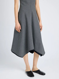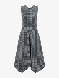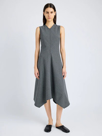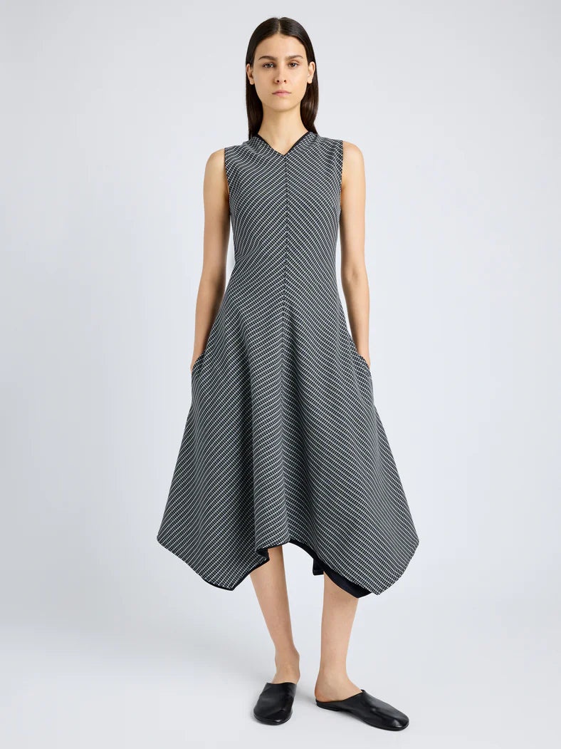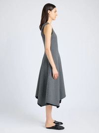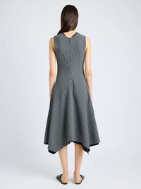 White Label Crafted in a black-and-white check print, it features a shallow V-neckline that transitions into a tailored bodice, softly cinching at the waist for a flattering shape. The dress falls into an A-line silhouette, finishing with a flared skirt and an asymmetric hem that adds a touch of modern movement. A center-front split enhances ease of movement, while a discreet zipper closure provides a clean finish.