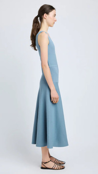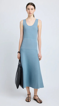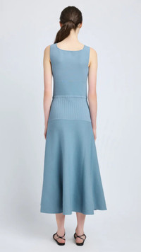 White Label The Lucia Dress in Souffle Knit is designed in a lark blue hue with a slim, sleeveless A-line silhouette that falls to a mid-length hem. Featuring a scoop neckline, the dress showcases a mix of intricate knit techniques throughout, adding subtle texture and detail.