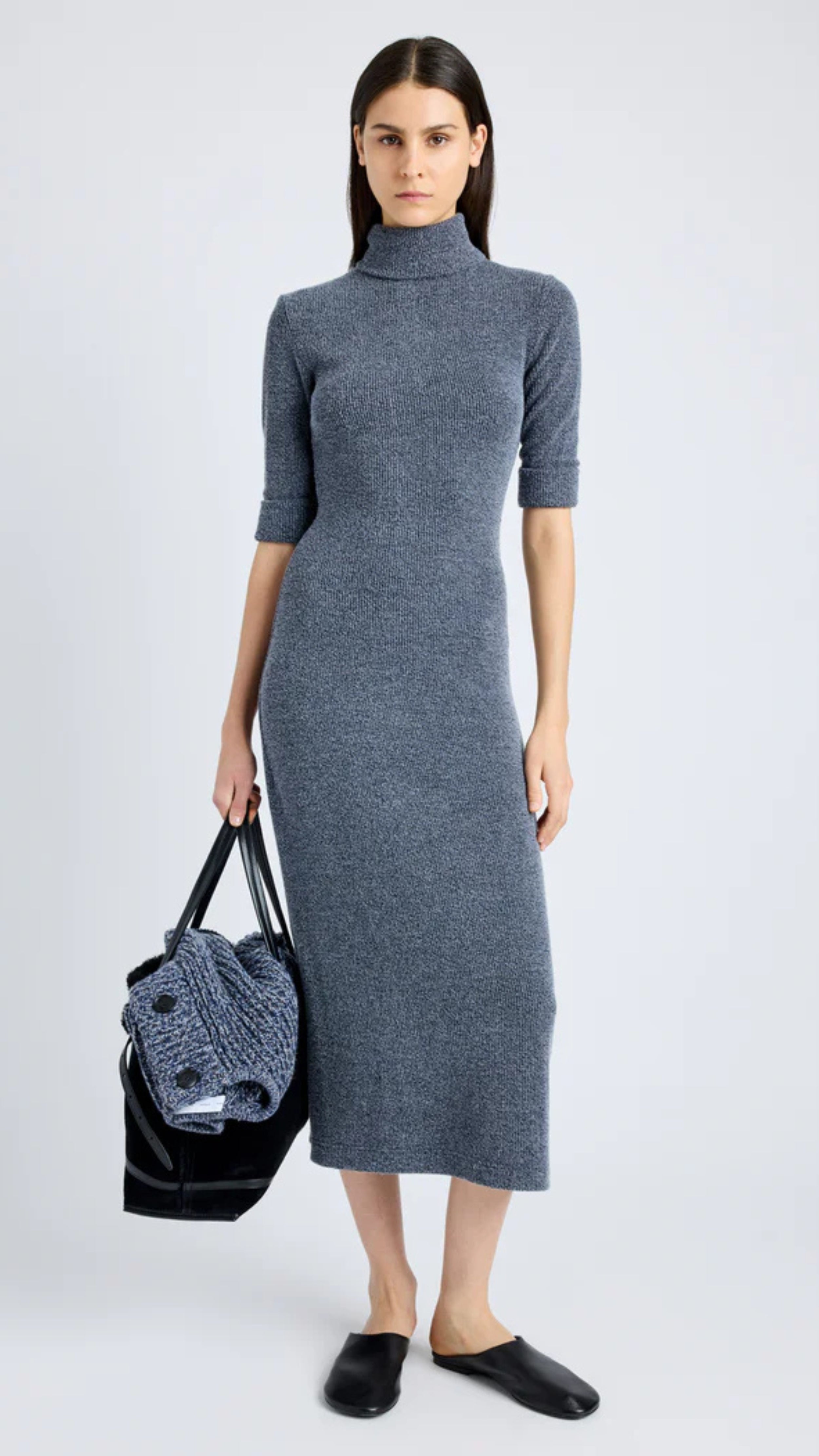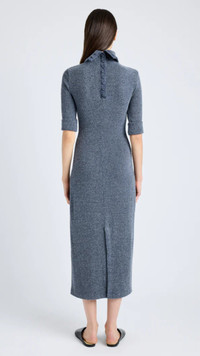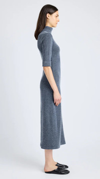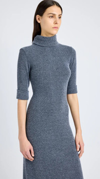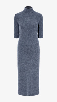 White Label The Cerine Dress in Boucle Rib is crafted in a slim silhouette with a textured ink melange finish. Designed with a turtleneck and cuffed sleeves, it features a refined buttoned placket along the upper back and a center slit at the hem for ease of movement. Tailored for a close fit.