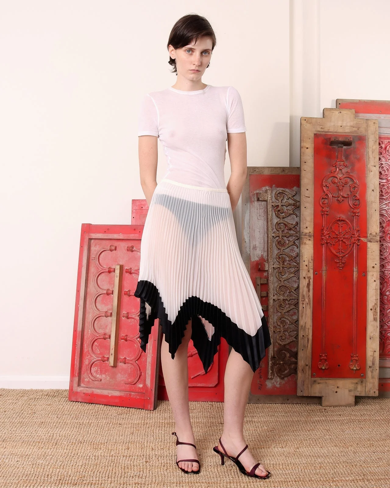 Made from delicate silk organza, this pleated skirt features an asymmetrical black satin contrast hemline for a unique touch. Part of the Spring/Summer 2025 runway collection, paired with the Beaded Skirt. The hidden side zipper adds a seamless, elegant finish.