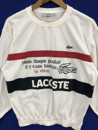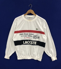 Lacoste big spell out crew neck sweatshirt pullover jumper. Good used conditions. There’s yellowish on some buttons places but not so obvious. Please check all pictures provided. Sz 4 fit like M Please check your measurements as tags size not run consistently across country/vintage items. Measurements: (inches) Pit to pit: 23 Length: 25.5 Shoulder: 21 Sleeves length: 22.5