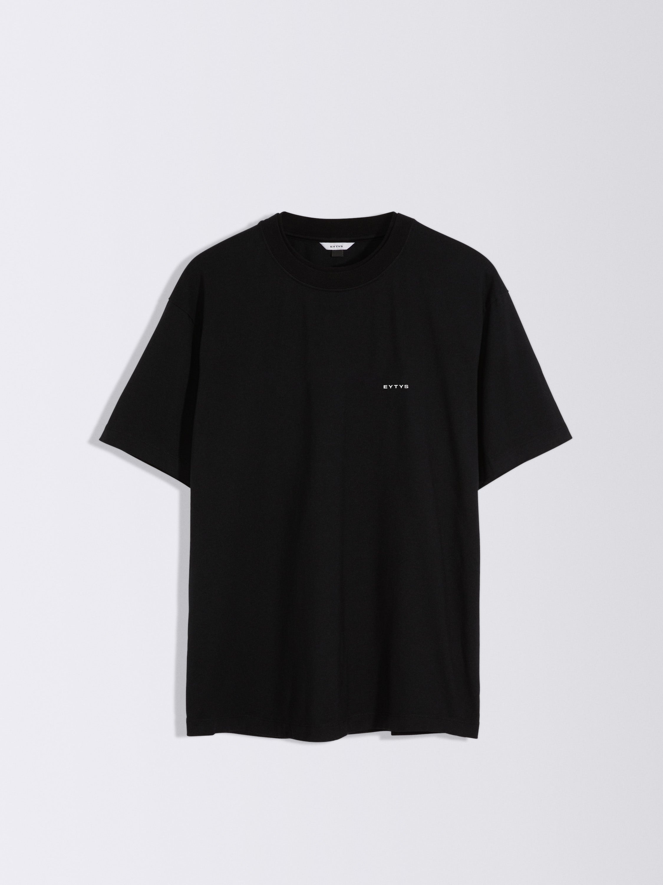 The 'Leon' T-Shirt in black is crafted from soft, durable medium-weight cotton jersey. Detailed with a double collar and printed EYTYS logo on the chest. Elias is 190 / 6'3" and is wearing men’s size L. Product Details: - 100% organic cotton - Relaxed fit - Double collar - Made in Portugal - Unisex