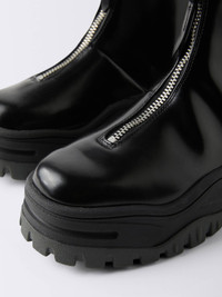 Rugged boot featuring a high elegant shaft with a heavy-duty silver zipper at the front. Made from shiny calf leather. Product Details: - Upper: cow leather - Lining: calf leather/cotton - Made in Vietnam"
