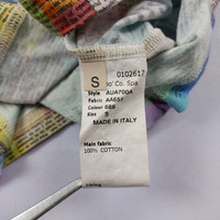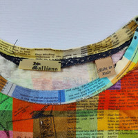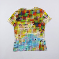 Size : Small - 18 In. Width - 24 In. Length - 17 In. Shoulder ( Pit to pit ) - 6 In. Sleeve length - 18.5 In. Hem 9.5/10 Overall usage No Issue Composition : - 100% Cotton Description : - John Galliano Original Print Fabric Blouse with colourful newspaper print. The model has a straight cut, short sleeves, and a round neck.