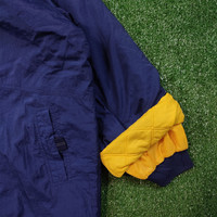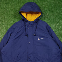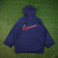 Size : Medium on tag but fits XL to XXL - 28 In. Width - 32.5 In. Length - 30 In. Shoulder to cuff - 22 In. Shoulder ( Pit to pit ) 25 In. Hem 9/10 Overall Usage. Note : Has a penmark inside of the jacket. But still very presentable to wear. Composition : - 100% Polyester - 100% Cotton lining Details : - Big Swoosh embroidery at the back of the piece - Chest logo embroidery - Vintage 90's released - Hard to find nowadays - Zipper fastening - Buttons with brand logo - Drawstrings waist ban