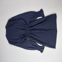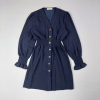 Size : Small - 15 In. Bust - 10 In. Waistline - 31 In. Length - 14 In. Shoulder (pit to pit) - 22 In.Sleeve length - 22 In. Hem 9.5++/10 Overall usage No issue Composition : - 100% Polyester Description : - Short dress, V-neck, long sleeves with smocked cuffs, smocking to waist, press stud placket closure on the front.