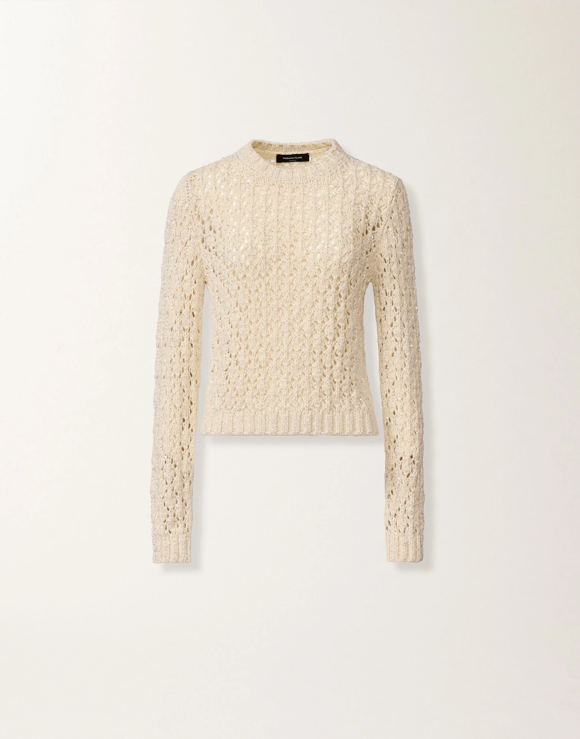 Crew neck sweater with an oversized fit crafted from cotton ribbon yarn and adorned with sequins, designed in an exclusive stitch pattern reminiscent of the natural thistle motif. The interplay between the irregular cotton ribbon and the sequins creates a textured and luminous effect of great elegance. Entirely made in Italy through sustainable processes. Details Cotton Ribbon Sequins Thistle Stitch Fabric: 71% cotton – 16% polyamide – 13% polyester Made in Italy Model MAD276F101M1020000VR1