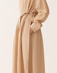 Shirt-style robe with a drawstring at the hem, crafted from a fluid fabric with a soft, lightweight feel. The premium Lyocell fiber, sourced from eucalyptus tree pulp, ensures durability, breathability, and a natural ability to absorb moisture. A versatile, elegant, and modern piece, entirely made in Italy using sustainable processes. The model is 1,76 m tall and wears size IT 40. Details Fluid Drawstring at the bottom Fabric: 100% lyocell Length: 128 cm (size 40) Made in Italy Model CAD266F181D95400000157