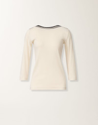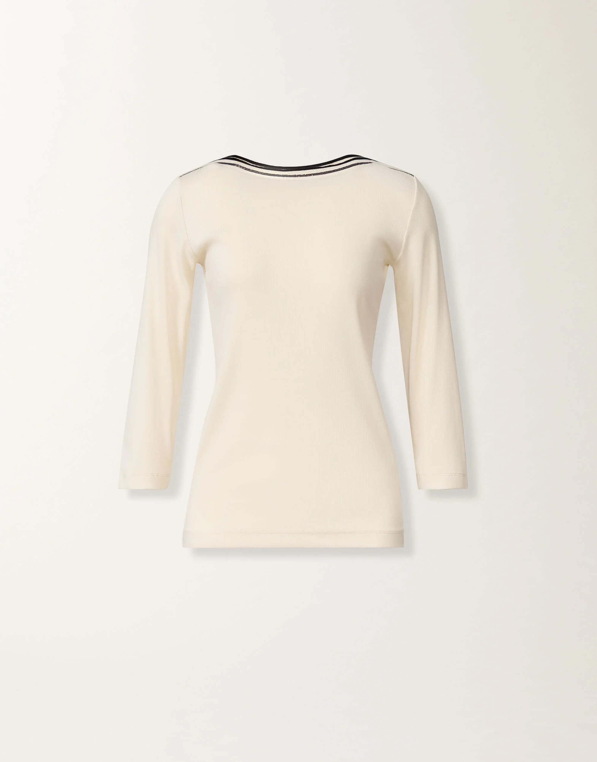 Bicolored ribbed cotton jersey mariniere T-shirt, enhanced by an elegant organic cotton collar. A versatile piece embellished with a diamond thread on the edge, designed as an everyday wardrobe essential. Entirely made in Italy with a focus on sustainability. The model is 1.80 m tall and wears size IT 40 Details Ribbed cotton jersey Fabric: 94% cotton – 6% elastane Collar: 100% cotton Made in Italy Model JED276F563M2030000VR2