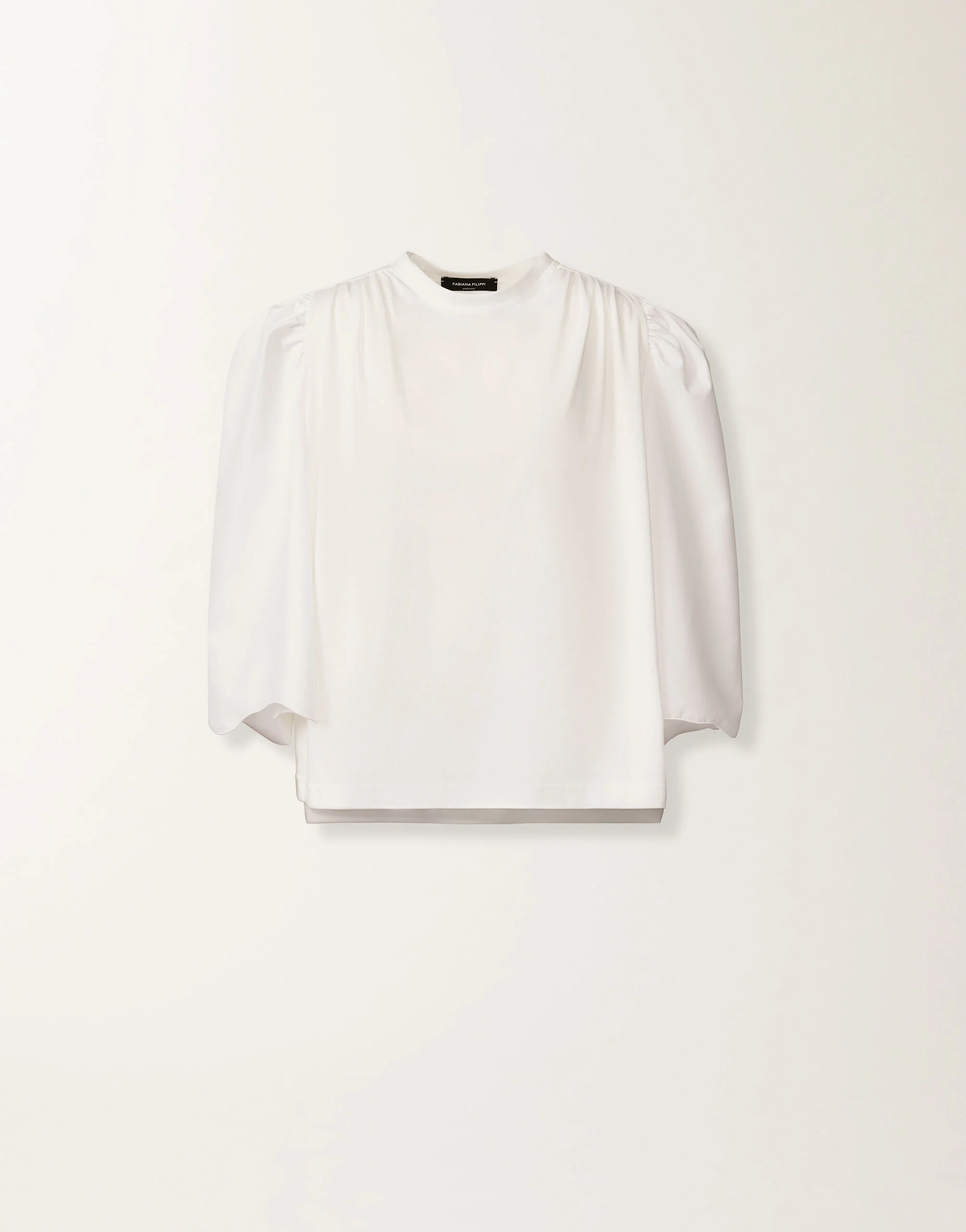 Cotton jersey T-shirt, enhanced with tone-on-tone puff sleeves in poplin that add a feminine and sophisticated touch. The scalloped wave embroidery at the hem accentuates the garment’s clean lines, making it versatile and elegant for any occasion. Entirely made in Italy, with a special focus on sustainability. The model is 1.76 m tall and wears size IT 40 Details Cotton jersey Puff sleeve Fabric: 100% cotton Poplin sleeve: 100% cotton Made in Italy Model JED276F576M185000021