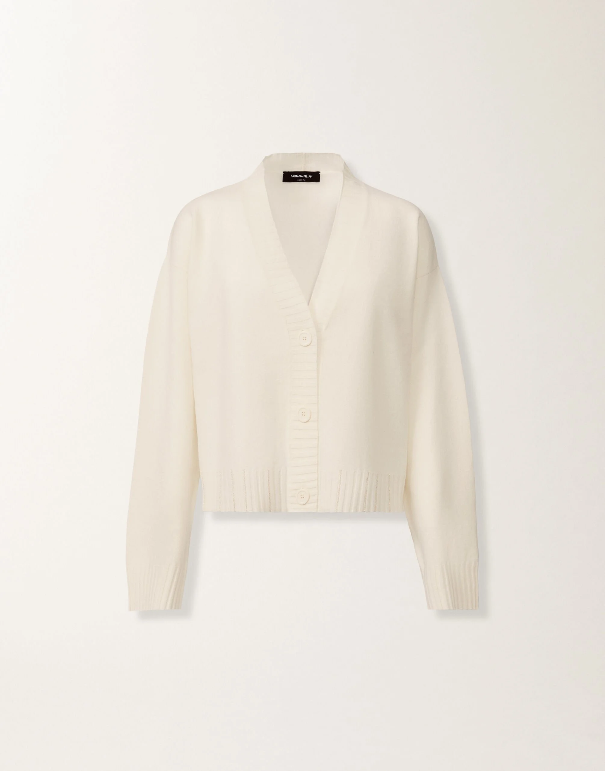 Made of Platinum, the exclusive Fabiana Filippi yarn that combines wool, cashmere and silk, this boxy cardigan is embellished with a diamond thread detail. Produced entirely in Italy through sustainable processes. The model is 1,79m tall and is wearing size IT 40 Details Platinum yarn Diamond thread Boxy Fabric: 75% wool - 15% silk - 10% cashmere Length: 55 cm (size 40) Made in Italy Model MAD215F024L517000025