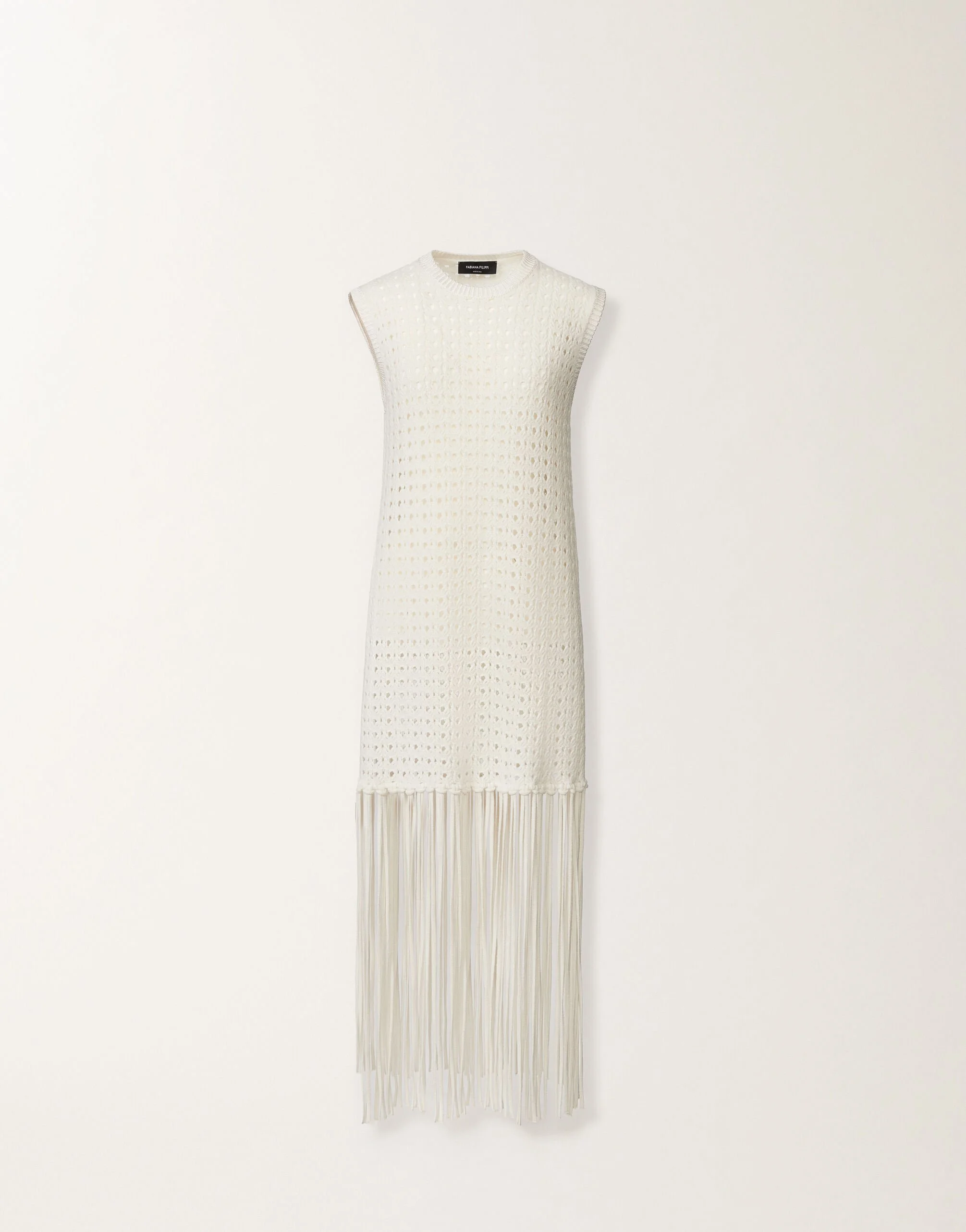 Made of Platinum, an exclusive Fabiana Filippi yarn that interweaves the softness of wool, cashmere and silk, this long crew-neck sweater features refined mesh knit, with fringes that define the hem and slit. Produced entirely in Italy through sustainable processes. The model is 1,77m tall and is wearing size IT 40 Details Platinum yarn Fringe on the hem Split Fabric: 75% wool - 15% silk - 10% cashmere Edging: 100% viscose Length: 127 cm (size 40) Made in Italy Model MAD215F156L505000025