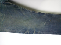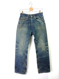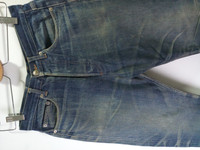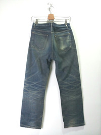 A.P.C. Bootleg model. Distressed and faded. Yellowing and mild stains on right thigh. Waist 28 Length 40 Rise 11.5 Leg Opening 8.5 Express shipping only !