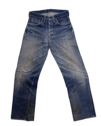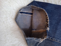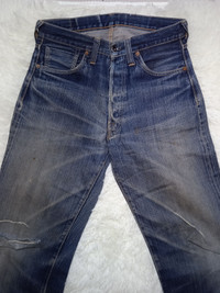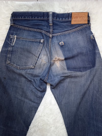 Very worn and distressed. Big blowout on the butts. Fit: Straight-leg, high-rise (classic 1950s-1960s style) • Denim: Selvedge denim, typically unsanforized (shrink-to-fit) • Construction: • Chain-stitched hems • Hidden rivets • Leather patch • Button fly Waist 30" Inseam 31" Outseam 41" Rise 10.5" Leg Opening 8.5" 3-7 days DHL Express shipping worldwide.