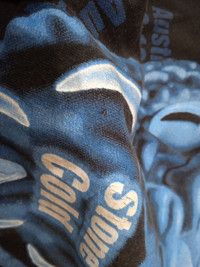 No flaws . Empty back. One hole on the front print. Tagged Youth XL. Please refer to the measurements before purchase. No refunds or returns.