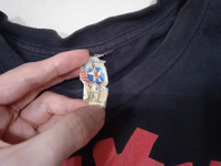 Well-worn. Faded. No major flaws other than one hole on the back. Please refer to measurements before purchase. No refunds or returns.