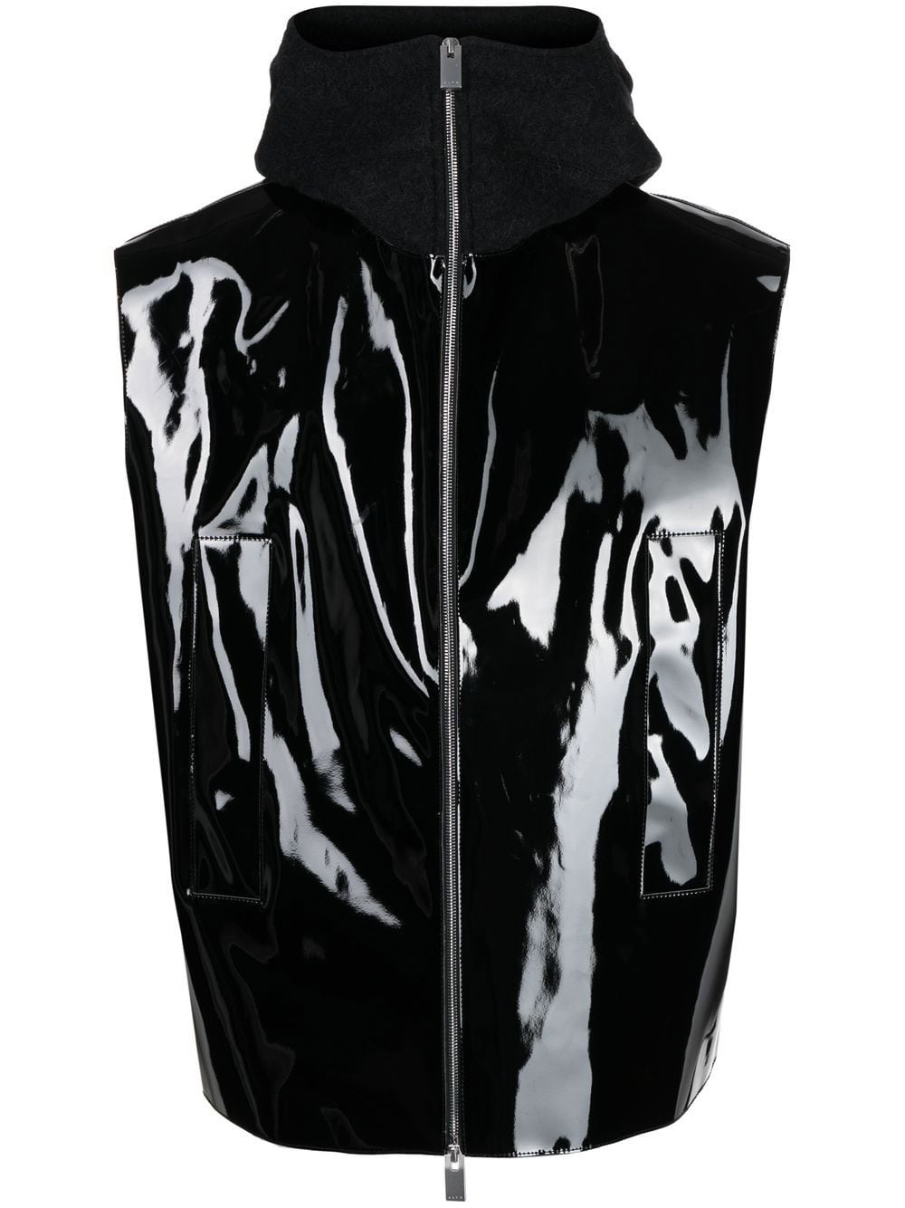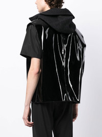 high-shine finish sleeveless vest jet black high-shine finish classic hood front zip fastening sleeveless Made in Italy Composition Body: Polyurethane 66%, Polyester 34% SIZE & FIT Model measurements Height 6 ft 3 in(1.9 m) Bust/Chest 34.64 in(88 cm) Hips 36.61 in(93 cm) Waist 27.55 in(70 cm) FittingInformation This piece fits true to size. We recommend you get your regular size Cut for a loose fit Made with a mid-weight non-stretch fabric Washing instructions Do Not Wash/Do Not Dry Clean