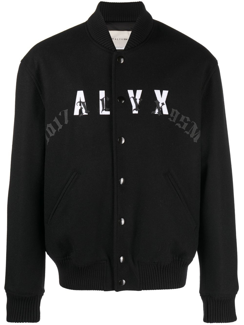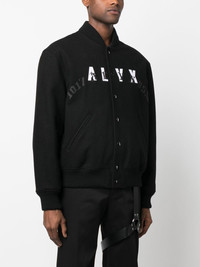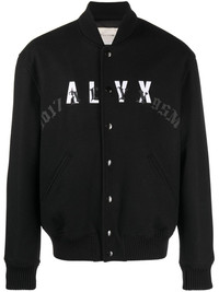leather-logo bomber jacket black/white wool blend leather logo patch to the front logo print to the front ribbed band collar front press-stud fastening long sleeves ribbed cuffs two diagonal pockets to the sides ribbed hem Made in Italy Composition Outer: Wool 80%, Polyamide 20% Lining: Viscose 100%, Polyester 100% SIZE & FIT Model measurements Height 6 ft 2 in(1.88 m) Bust/Chest 36.61 in(93 cm) Hips 35.82 in(91 cm) Waist 27.95 in(71 cm) FittingInformation This piece fits true to size. We recommend you get your regular size Cut for a loose fit Made with a mid-weight non-stretch fabric Washing instructions Do Not Wash/Do Not Dry Clean