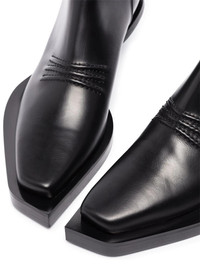 Leone ankle boots Don't you agree that shoe-contact comes before eye-contact? Then make sure you're ready to create a great first impression with these black leather Leone ankle boots from 1017 ALYX 9SM that has a striking design that will turn heads down the street. Let the compliments start rolling in. Featuring a square toe, a smooth surface with a matte finish, stitching details, a rear zip fastening, a mid-high block heel and pointed sole. Made in Italy Composition Outer: Leather 100% Lining: Leather 100% Sole: Leather 100% SIZE & FIT Model measurements Height 5 ft 11 in(1.8 m) Bust/Chest 31.49 in(80 cm) Hips 37 in(94 cm) Waist 25.98 in(66 cm) FittingInformation This piece fits true to size. We recommend you get your regular size Measurement HEEL 2.36 in(6 cm) Sole height 0.78 in(2 cm)