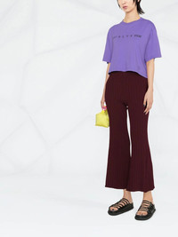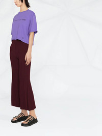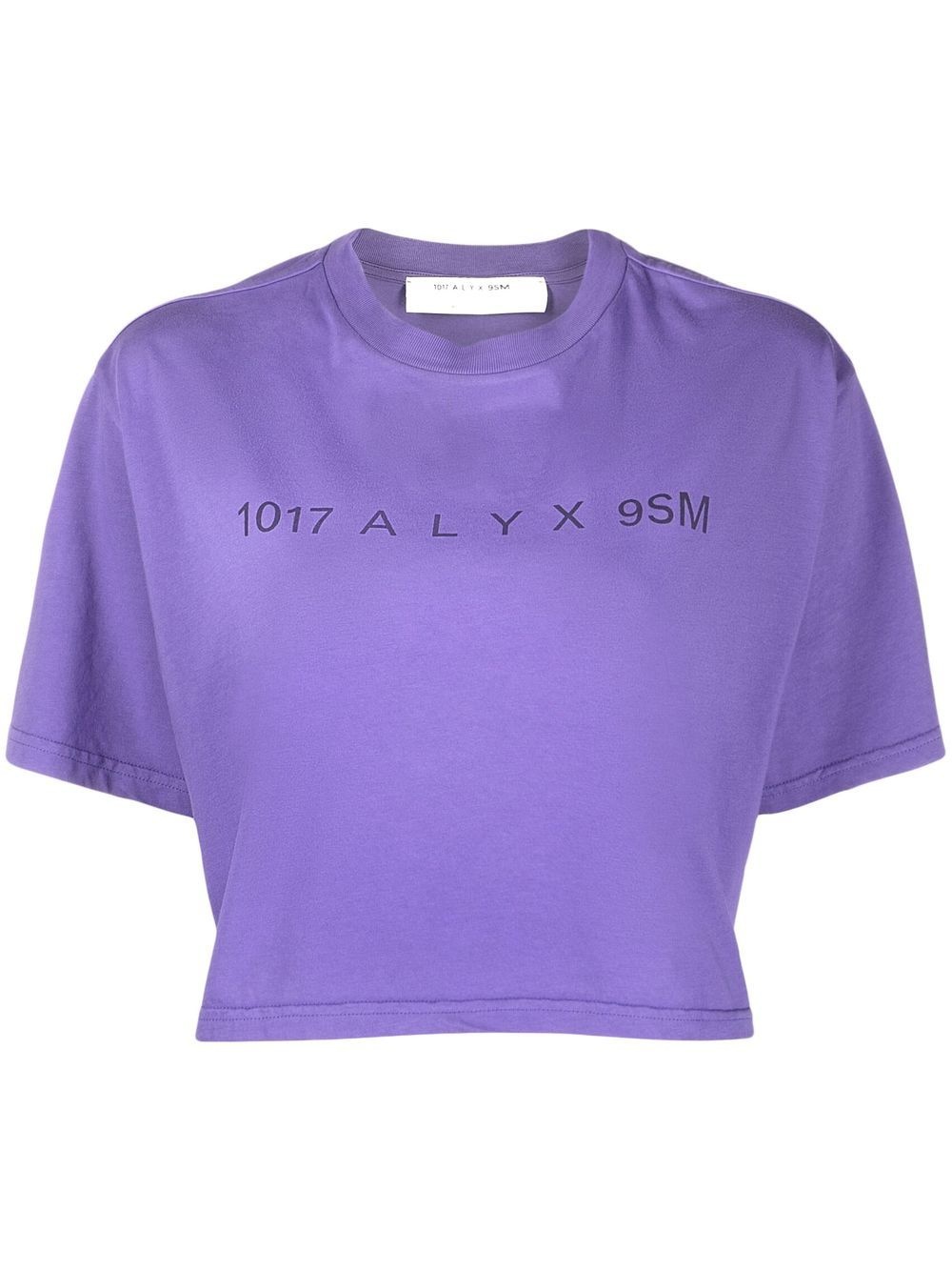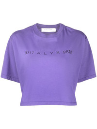 logo-print cropped T-shirt This purple short sleeve-T-shirt is characterised by a 1017 Alyx 9SM print on the chest. The number 1017 is a reference to Williams' birthday, October 17, and 9SM is an abbreviation of the brand's founding studio address in Saint Mark's Place, New York City. Made in Italy Composition Cotton 100% SIZE & FIT Model measurements Height 5 ft 11 in(1.8 m) Bust/Chest 31.49 in(80 cm) Hips 35.43 in(90 cm) Waist 25.19 in(64 cm) FittingInformation This piece fits true to size. We recommend you get your regular size Cut for a loose fit Made with a mid-weight fabric Washing instructions Machine Wash
