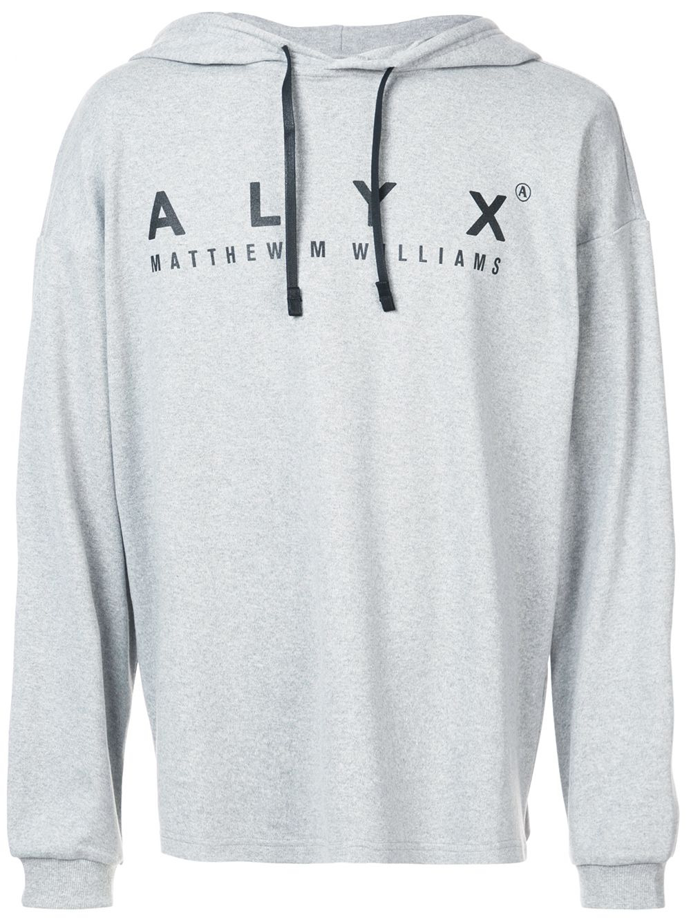 logo-print hoodie Grey cotton blend logo-print hoodie from ALYX. Please note this item is unisex and sold in men's sizing. Made in Italy Composition Polyester 50%, Cotton 50% SIZE & FIT Model measurements Height 5 ft 10 in(1.77 m) Bust/Chest 33.85 in(86 cm) Hips 35.03 in(89 cm) Waist 24.01 in(61 cm) Washing instructions Machine Wash