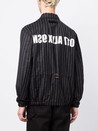logo-stripe virgin-wool jacket Presented in a sleek black colourway, this jacket from 1017 ALYX 9SM is a display of the brand’s contemporary aesthetic. Crafted in Italy from a blend of virgin-wool and cashmere, it is defined by a logo-print striped pattern throughout and features a mirrored logo print to the rear. Highlights - Black - Virgin wool-cashmere blend - Vertical stripe pattern - All-over logo print - Classic collar - Logo print to the rear - Concealed front button fastening - Long sleeves - Drawstring waist - Straight hem Made in Italy Composition Body: Virgin Wool 99%, Cashmere 1% Lining: Cupro 56%, Viscose 44% SIZE & FIT Model measurements Height 6 ft 2 in(1.89 m) Bust/Chest 37.4 in(95 cm) Hips 36.61 in(93 cm) Waist 28.34 in(72 cm) FittingInformation Designed to be unstructured, offering a loose fit throughout Made from a midweight non-stretch fabric This piece fits true to size – take your usual size Washing instructions Dry Clean Only