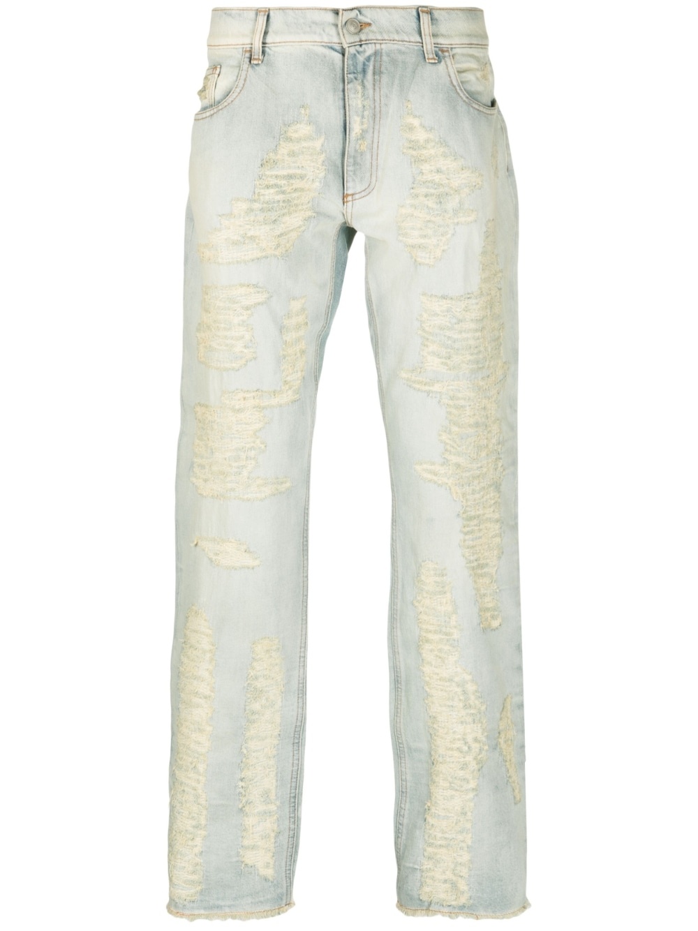 ripped mid-rise straight-leg jeans Highlights - Light blue/light beige - Cotton - Denim - Ripped detailing - Straight leg - Mid-rise - Concealed fly and button fastening - Belt loops - Classic five pockets - Frayed hem Made in Italy Composition Lining: Cotton 100% Outer: Cotton 100% SIZE & FIT Model measurements Height 5 ft 11 in(1.8 m) Bust/Chest 33.07 in(84 cm) Hips 37.4 in(95 cm) Waist 25.19 in(64 cm) FittingInformation Designed with a straight leg, these jeans allow for an unrestricted and comfortable fit over the leg Sturdy and hard-wearing, this denim piece offers no stretch This piece fits true to size – take your usual size Washing instructions Machine Wash